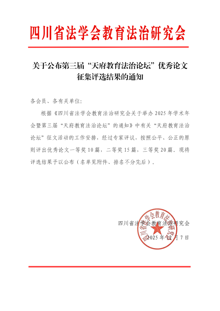 为深入推进教育法治理论与实践创新,12月7日,四川省法学会教育法治研究会2025年度学术年会暨第三届天府教育法治论坛在成都师范学院举办。本次论坛以“面向‘十五五’的教育法治建设”为主题,汇聚全省学界、实务界精英共同探讨行业重点难点问题。经专家评议,我校教师张雅露、吴柞厚所作《未成年人犯罪的年龄差异、成因机理与分龄治理——基于西部M市法治教育的实证研究》,凭借扎实的实证分析与创新的治理思路,荣获论坛优秀论文二等奖。